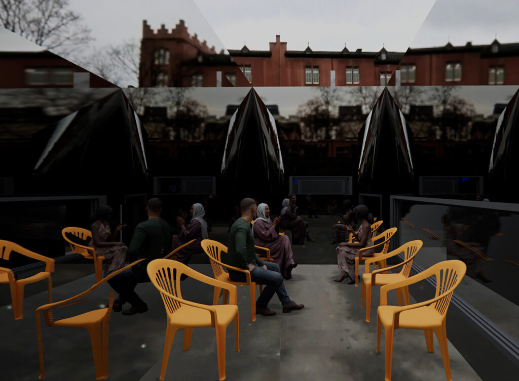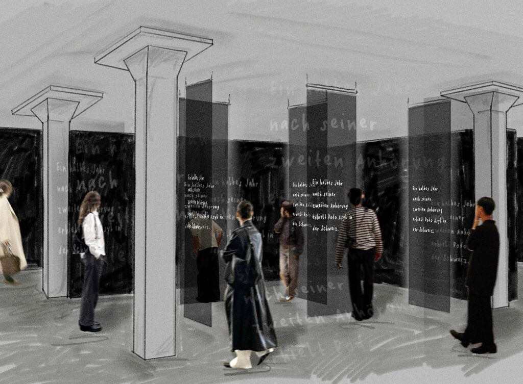 Ausgangspunkt des Projekts ist die Analyse der Anhörungspraxis aus räumlicher und szenografischer Perspektive. Durch Recherchen, Rollenspiele sowie persönliche Auseinandersetzungen mit Personen mit Fluchterfahrung näherten sich die Studierenden der vielschichtigen Dynamik dieses Ortes.